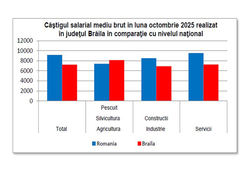 Chiar și așa, salariile brăilenilor sunt cu mult în urma salariului mediu pe țară: la nivel național, salariul mediu brut realizat în luna octombrie 2025 a fost de 9.152 lei, iar cel net de 5.492 lei.