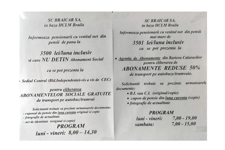 În același timp, SC Braicar SA Brăila informează că pensionarii cu venituri nete din pensii mai mari de 3.501 lei/lună (inclusiv) se pot prezenta la Agenția de abonamente a societății, din Bariera Călărașilor, pentru eliberarea de abonamente de transport reduse 50% pe autobuz sau tramvai. Solicitanții trebuie să prezinte: actul de identitate în copie și original, cuponul de pensie din luna curentă (copie) și o fotografie de actualitate. Programul agenției de abonamente este de luni până vineri, între orele 7:00 și 19:00, iar sâmbăta de la 7:00 la 15:00.