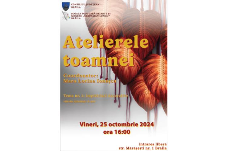 „Dăm startul unei noi serii de evenimente tematice, atelierele de artă decorativă, create special pentru toți cei dornici să își dezvolte simțul estetic, dar și îndemânarea. Vei învăța să creezi cu propriile mâini obiecte pline de farmec și personalitate, folosind diverse materiale și tehnici creative, într-un cadru distractiv și relaxat. Tema primei întâlniri este crearea împletiturilor decorative”, precizează surse din cadrul instituției de învățământ brăilene. Coordonator al „Atelierelor Toamnei” este Mara Lorina Ionașcu.