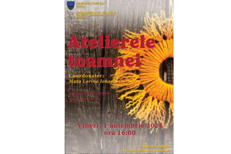 Vineri, 1 noiembrie, de la ora 16:00, la sediul Școlii Populare de Arte „Vespasian Lungu” Brăila, din Centrul Istoric al municipiului (Strada Mărășești nr. 1), are loc ce-a de a doua întâlnire din cadrul proiectului Atelierele Toamnei (coordonator Mara Lorina Ionașcu).