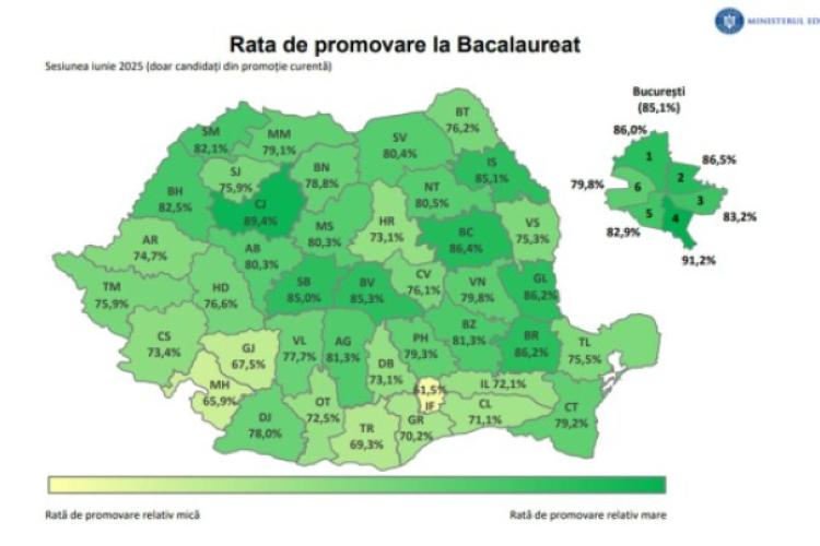 După afișarea primelor rezultate la examenul naţional de Bacalaureat, sesiunea iunie 2025, Brăila se află pe locul 3 pe țară, la fel ca anul trecut. Înainte de contestaţii, judeţul nostru are o promovabilitate de 86,2% în rândul candidaţilor din seria curentă, după cum arată un raport al Ministerului Educaţiei. Pe locul 1 se află judeţul Cluj – 89,4%, iar pe locul 2 Bacău – 86,4%. La polul opus, cele mai slabe rezultate sunt în județele Ilfov – 61,5% și Mehedinți – 65,9%.