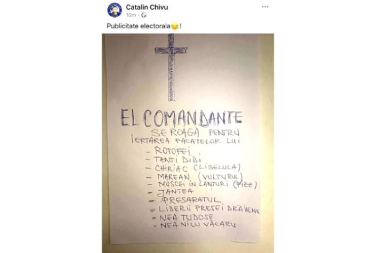 Băi, băiete! Cătălin Chivu, cel mai milițian dintre jurnaliști și cel mai ziarist dintre milițieni, a dat o dumă care ar fi trebuit să ne lase lați! Cam cum l-a lăsat pe el Nea Nicu Ardeleanu, fermierul luptător K1, dacă o credem p-aia cu mâna ruptă. Despre ce este vorba? Păi, Cătălin Chivu zis și El Comandante a publicat pe pagina personală de Facebook, sub o cruce mare, un pomelnic pentru morți. Cică publicitate electorală!!! Numai că morții sunt vii, dar l-au supărat pe Chivu că altfel nu se explică de ce respectivii sunt enumerați sub o cruce mare și neagră. Într-o companie selectă sunt și colegii de la Obiectiv sub denumirea ”liderii presei brăilene”. Daaar, colegii noștri sunt abia pe poziția a 8-a, ce-i drept înaintea lui nea Tudose (europarlamentarul Mihai Tudose) și nea Văcaru (Nicu Ardeleanu) care este ultimul pe lista morților lui Chivu. Pe prima poziție, doamnelor și domnilor, este Rotofeiul (prefectul Iulian Timofei), urmat, atenție!, de tanti Didi (Didi Crintea, directoarea Spitalului Județean de Urgență). Oare cu ce l-o fi deranjat tanti Didi? Nu i-o fi dat medicamente! Da’ ce treabă are tanti Didi, că secția ”agitați” este în alt spital. În fine, mai departe urmează Chiriac, zis și Libelula (președintele CJ și-al PSD). Pe locul 4, Marean (Vulturu), primarul municipiului, iar pe poziția a 5-a intră ”Mușchi în lanțuri” care cică ar fi vicepreședintele CJ Ionuț Dobre (PSD). Urmează Jantea (viceprimarul municipiului căruia nu i-a găsit o poreclă) urmat de Presaratul, nu am reușit să identificăm cine se ascunde sub acest ”pseudonim”. Abia apoi, cum spuneam, liderii presei brăilene, Mihai Tudose și Nicu Ardeleanu. Acum, avem două posibilități: Uno, ne rugăm la Dumnezeu să-i dea lui El Comandante ce dorește el celor de pe lista neagră. Având în vedere că ziariștii de la Obiectiv sunt creștini veritabili, ne vom ruga cu toții să-i dea Dumnezeu sănătate lui Cătălin Chivu ca să avem cel puțin noi, de la scormonitoru, de cine să facem mișto. Plus că este cea mai ”bună” campanie electorală pentru cei pe care-i consiliază. De altfel, devine evident că alde Chivu este obsedat de cruci. I-a mai îngropat el pe Marean și Chiriac în campania electorală, la locale, numai că sub sloganul ”Pe 9 iunie vă îngropăm!” a picat taman Canciu, zis și 8 la sută. Așa că succesuri cu noii pretendenți, El Comandante! (Secția de Psihiatrie)