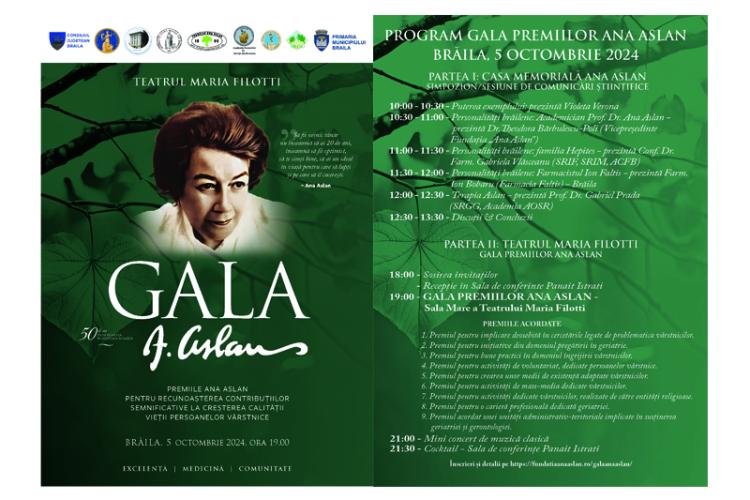 Pe 5 octombrie, Fundația „Ana Aslan” organizează Gala Premiilor Ana Aslan, în Brăila, ”un eveniment ce celebrează excelența în geriatrie și gerontologie”. Despre program am primit ieri un comunicat de presă din partea organizatorilor, pe care îl dăm publicității integral :