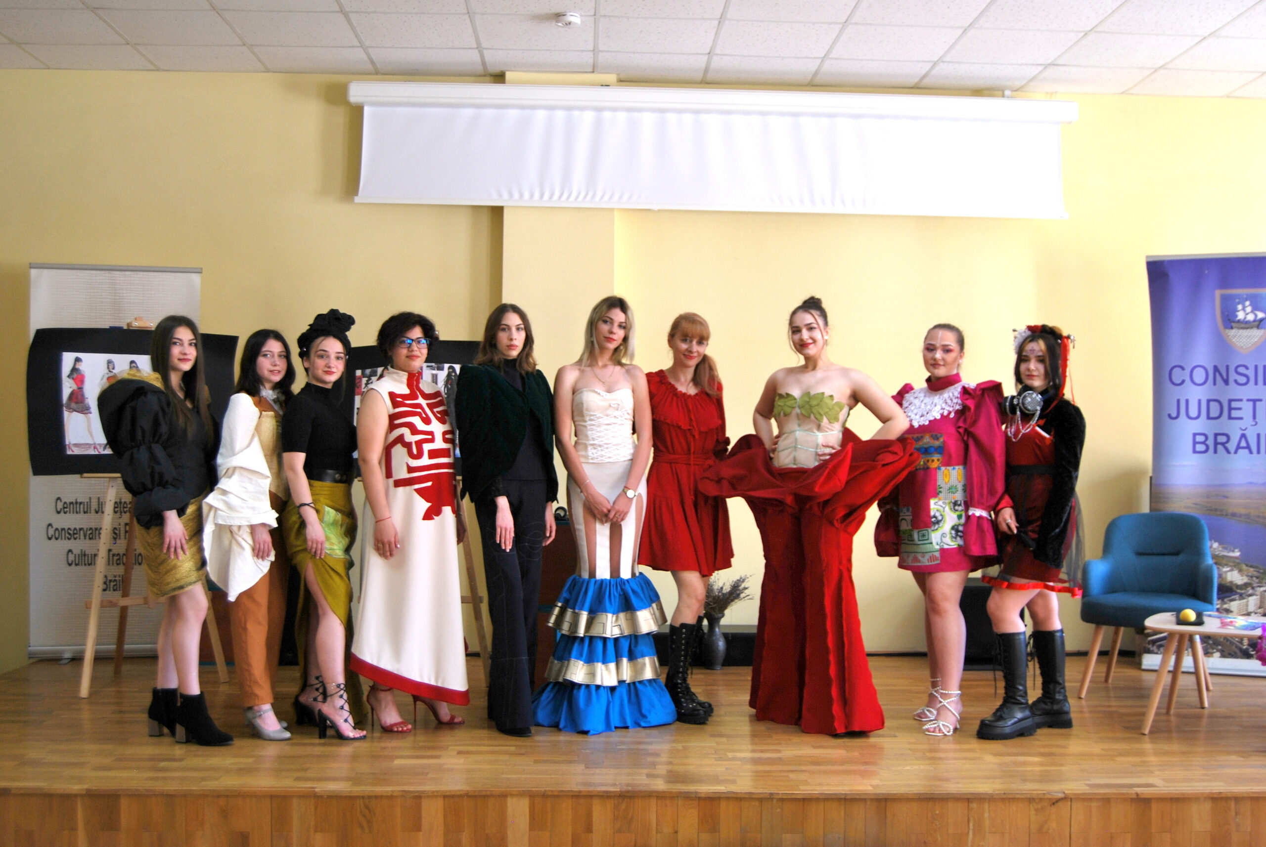 * absolventele clasei a XII-a B de la Liceul de Arte „Hariclea Darclee” Brăila – Secția Design vestimentar au participat, marți, la o prezentare de modă de zile mari, sub îndrumarea prof. Florentina Giol * vădit emoționate, adolescentele și-au prezentat ținutele vestimentare create la sfârșit de liceu, Haute couture, pentru susținerea atestatului * fiecare elevă a adăugat ținutei elemente proprii, originale, având ca temă fie „Egiptul antic”, „Africa”, „China”, „Turcia” sau „Japonia” * pentru alte ținute, viitoarele creatoare de modă s-au inspirat din Art Nouveau sau stilul neoclasic