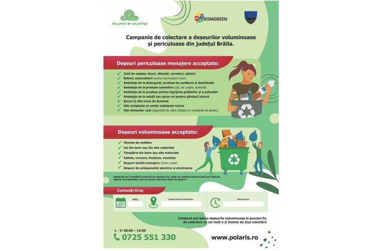 Operatorul de salubritate Polaris M Holding SRL anunță că, în perioada 14 – 22 octombrie, se va derula campania trimestrială de colectare GRATUITĂ a deșeurilor voluminoase și a celor periculoase menajere în toate comunele din Zona 1 din Județul Brăila. În această zonă sunt incluse următoarele localități: Cazasu, Chiscani, Frecăței, Gemenele, Mărașu, Măxineni, Romanu, Salcia Tudor, Scorțaru Nou, Siliștea, Tichilești, Tudor Vladimirescu, Vădeni. Campania se adresează populației și este organizată de compania de salubritate Polaris, în calitate de lider al Asocierii și PHG Waste Management SRL (Asociat), în parteneriat cu Asociația de Dezvoltare Intracomunitară (ADI) Eco Dunărea Brăila.