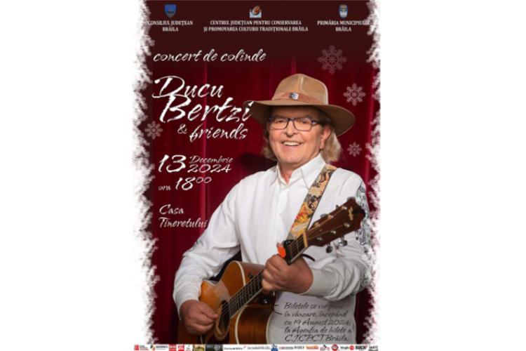 Marele artist și interpret de muzică folk Ducu Bertzi va concerta la Brăila. Evenimentul, intitulat „Ducu Bertzi & friends”, este organizat de Consiliul Județean Brăila – prin Centrul Județean pentru Conservarea și Promovarea Culturii Tradiționale (Centrul de Creație Brăila) – și Primăria Municipiului Brăila și va avea loc în ziua de 13 decembrie, la Casa Tineretului, începând cu ora 18:00. Biletele pentru concertul „Ducu Bertzi & friends” s-au pus deja în vânzare la Agenția de bilete a Centrulu ide Creație Brăila, dar și pe www.blt.ro.
