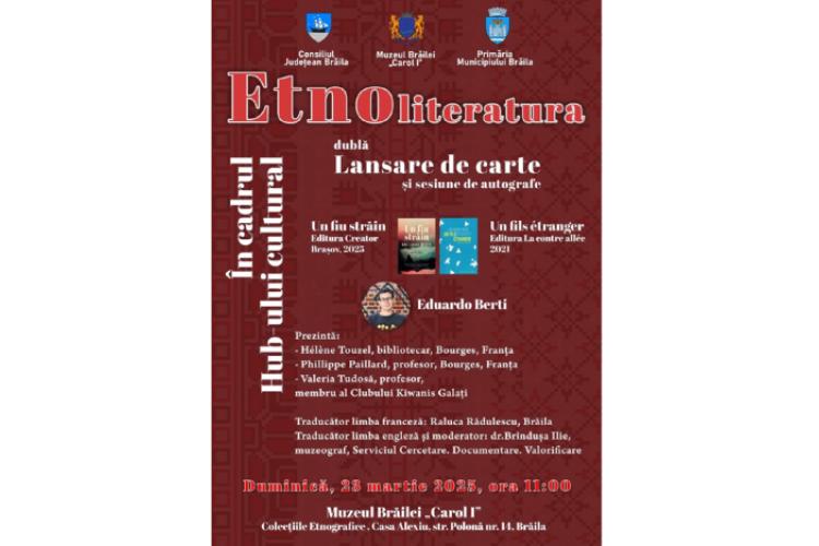 Începând cu ora 11:00, publicul brăilean este invitat la lansarea cărții în limba română „Un fiu străin”, Editura Creator, Brașov, 2025, și a cărții în limba franceză „Un fils étranger”, Editura „La contre allée”, 2021, autor Eduardo Berti, Buenos Aires, Argentina.