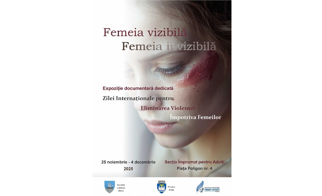 Secția Împrumut Carte pentru Adulți din cadrul Bibliotecii Județene „Panait Istrati” Brăila organizează, în perioada 25 noiembrie – 4 decembrie 2025, expoziția documentară dedicată Zilei Internaționale pentru Eliminarea Violenței împotriva Femeilor. Expoziția este intitulată „Femeia vizibilă, femeia invizibilă” și reunește volume din colecțiile bibliotecii publice, care abordează această temă.