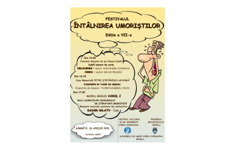 Centrul Cultural și de Agrement „Chira Chiralina” Brăila, în parteneriat cu Academia de Umor „Chira Chiralina”, îi invită pe brăileni la Gala Laureaților celei de a VII-a ediții a Festivalului Concurs „Întâlnirea Umoriștilor”, eveniment devenit tradiție, dedicat literaturii umoristice și artelor conexe. Gala va avea loc sâmbătă, 26 aprilie, la Sala „Regele Ferdinand I și Regina Maria” a Muzeului Brăilei „Carol I”, începând cu ora 17:00.