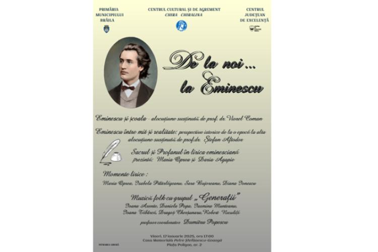 Centrul Cultural și de Agrement ”Chira Chiralina” Brăila invită iubitorii de cultură, vineri, 17 ianuarie 2025, începând cu ora 17.00, la Casa Memorială ”Petre Ştefănescu-Goangă”, să își reamintească de geniul lirismului românesc, Mihai Eminescu, de la nașterea căruia s-au împlinit 175 de ani.