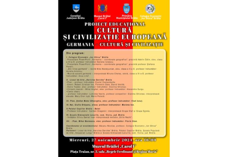 Invitație la spectacol. Muzeul Brăilei „Carol I” găzduiește miercuri, 27 noiembrie, ora 16:00, la sediul din Piața Traian nr. 3 – Sala „Regele Ferdinand I și Regina Maria”, spectacolul de muzică și poezie cu tema „Germania – cultură și civilizație”, organizat de Colegiul Economic „Ion Ghica” Brăila, în parteneriat cu Liceul de Arte „Hariclea Darclée”, Palatul Copiilor, Școala Populară de Arte „Vespasian Lungu” și Școala Gimnazială Lanurile, comuna Viziru, județul Brăila.