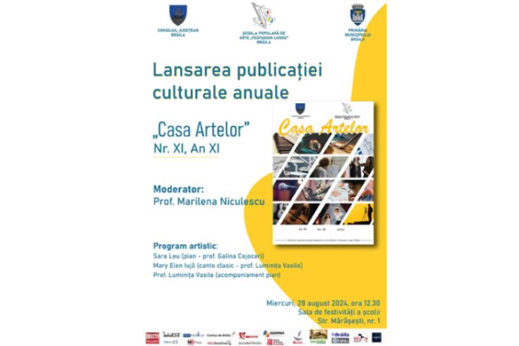 Potrivit comunicatului trimis de managerul instituției, Geanina Valentina Onodi, Școala Populară de Arte și Meserii „Vespasian Lungu” Brăila, cu sprijinul Consiliului Județean și al Primăriei Municipiului Brăila, invită publicul brăilean la lansarea publicației culturale anuale intitulată „Casa Artelor” (numărul XI, anul XI). Evenimentul va avea loc în ziua de miercuri, 28 august, începând cu ora 12.30, în Sala de festivități a Școlii de Arte „Vespasian Lungu”, din Strada Mărășești nr. 1.