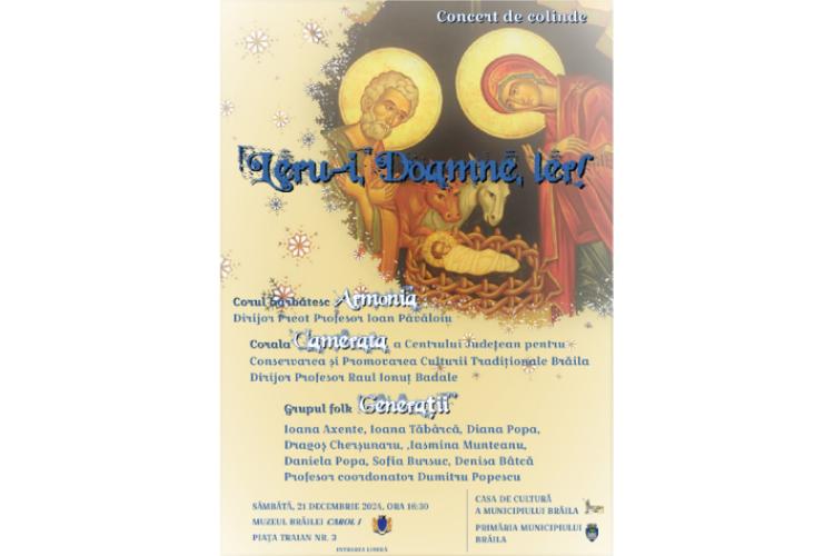 Potrivit managerului Casei de Cultură a Municipiului, Emanoil Ciucașu, în cadrul manifestării sugestiv intitulată „Leru-i, Doamne, ler!”, Corul bărbătesc „Armonia” al Casei de Cultură a Municipiului Brăila, dirijat de neobositul preot profesor Ioan Păvăloiu, și Corala „Camerata” a Centrului Judeţean pentru Conservarea şi Promovarea Culturii Tradiţionale (Centrul de Creație) Brăila, dirijată de căpitan Raul Badale – conducătorul Muzicii Militare a Garnizoanei Brăila -, vă vor încălzi sufletele cu colinde tradiţionale româneşti, iar Grupul folk „Generaţii” (în componența: Ioana Axente, Ioana Tăbârcă, Diana Popa, Dragoș Cherșunaru, Iasmina Munteanu, Daniela Popa, Sofia Bursuc și Denisa Bâtcă), condus de profesorul Dumitru Popescu, va susține un captivant recital de colinde şi cântece de iarnă.