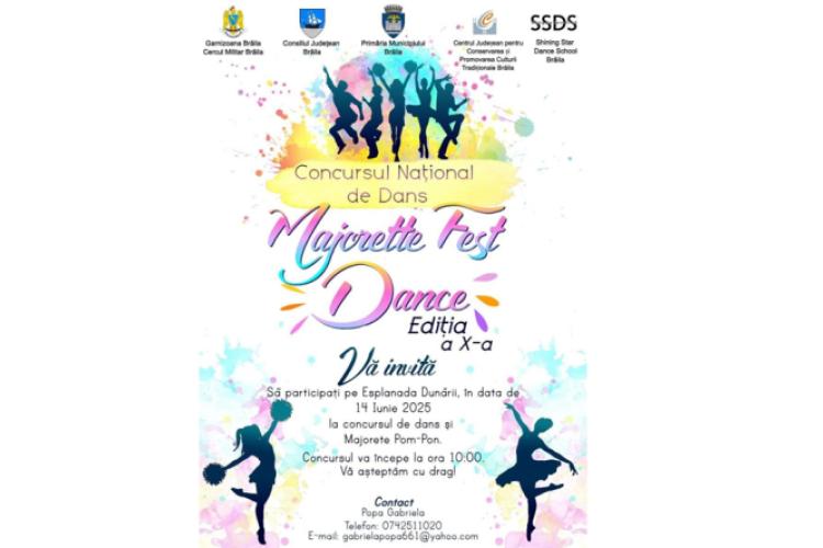 Centrul Militar Brăila, în colaborare cu Shining Star Dance School Brăila, Centrul Județean pentru Conservarea și Promovarea Culturii Tradiționale, Consiliul Județean și Primăria Municipiului Brăila, organizează sâmbătă, 14 iunie, de la ora 10:00, pe Esplanada Dunării, cea de a X-a ediție a Conscursului Național de Dans „Majorette Fast Dance”.