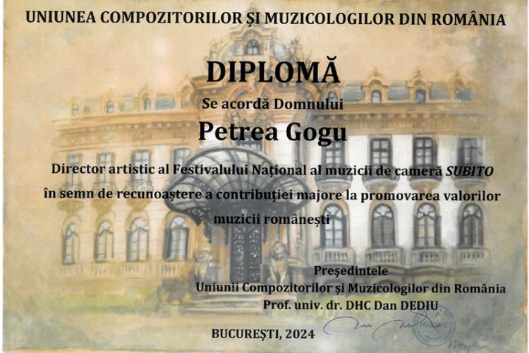 Efortul organizatorilor a fost răsplătit prin acordarea unei diplome managerului Petrea Gogu, de către prof. univ. dr. DHC Dan Dediu, compozitor, așa cum reiese din comunicatul de presă făcut public: ”Un moment plin de satisfacție, onorant, înălțător, a fost cel în care pasiunea și dăruirea ce s-au cumulat pentru realizarea SUBITO și-au găsit recunoașterea prin acordarea de către domnul prof. univ. dr. DHC Dan Dediu, compozitor, domnului manager Petrea Gogu, director artistic al festivalului, a diplomei din partea Uniunii Compozitorilor și Muzicologilor din România pentru contribuția majoră la promovarea valorilor muzicii românești.