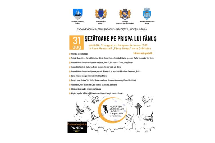 Sâmbătă, 31 august, începând cu ora 17.00, la Muzeul Brăilei „Carol I” – Casa Memorială „Fănuş Neagu”, din com. Gradiștea, jud. Brăila, are loc evenimentul cultural „Șezătoare pe prispa lui Fănuș”, organizat de Consiliul Județean Brăila, Muzeul Brăilei „Carol I”, Asociația „Prietenii Muzeului Brăilei” și Primăria Municipiului Brăila. Prezintă: Gabriela Popa. Manifestarea face parte din mai amplul eveniment desfășurat în toată țara, în ziua de 31 august, și anume „Noaptea Muzeelor la Sate”, la care participă și muzeul brăilean.