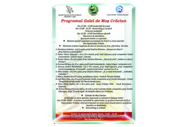 • evenimentul va avea loc vineri, 13 decembrie, între orele 11:00 – 16:00, la sediul Școlii Populare de Arte „Vespasian Lungu”, din Strada Mărășești nr. 1 • Gala de Moș Crăciun este organizată în colaborare cu Școala Populară de Arte „Vespasian Lungu” și Liceul de Arte „Hariclea Darclee” și va include momente artistice prezentate de tinerii cu nevoi speciale din Organizația „Trebuie” și de elevii Liceului de Arte „Hariclea Darclee”