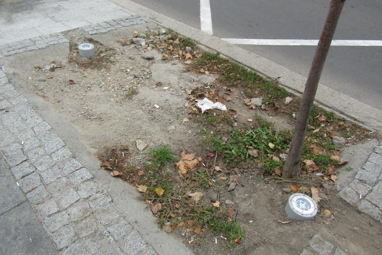 • este vorba despre situația casetelor pentru spații verzi, care au rămas nefinalizate de luni de zile, în loc de gazon și flori fiind pline de beton spart, pietriș, chiștoace și alte asemenea