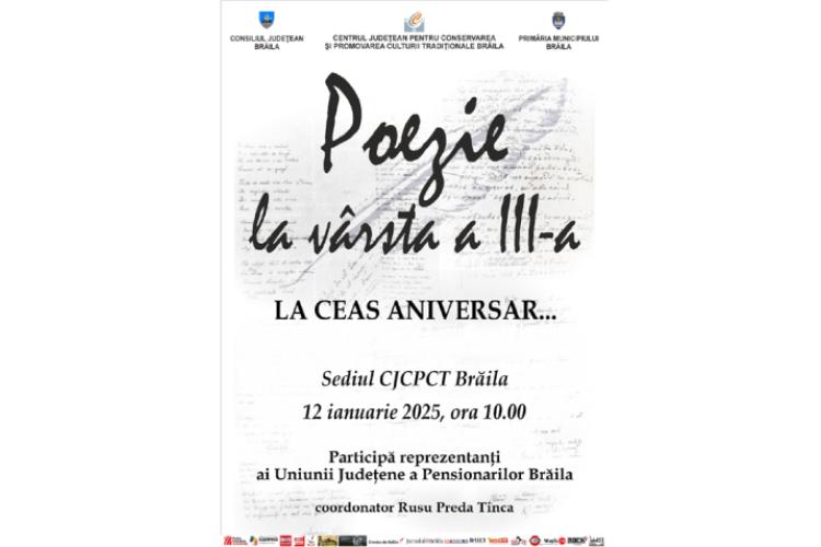 Consiliul Județean Brăila – prin Centrul Județean pentru Conservarea și Promovarea Culturii Tradiționale – și Primăria Municipiului Brăila organizează duminică, 12 ianuarie, începând cu ora 10:00, evenimentul cultural-educativ „Poezie la vârsta a III-a. La ceas aniversar…”. Evenimentul va avea loc în Sala ProArte a Centrului Județean pentru Conservarea și Promovarea Culturii Tradiționale Brăila (Centrul de Creație), din Piața Traian nr. 2, cu participarea membrilor Uniunii Județene a Pensionarilor Brăila, coordonată de Tinca Rusu Preda.
