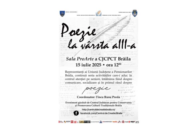 Consiliul Județean Brăila prin Centrul Județean pentru Conservarea și Promovarea Culturii Tradiționale și Primăria Municipiului Brăila organizează, în ziua de marți, 15 iulie, începând cu ora 12:00, activitatea culturală „Poezie la vârsta a treia”, desfășurată sub egida proiectului „La o cafea despre Brăila”, un eveniment dedicat verii – anotimp al bucuriei și al relaxării – poeziei și socializării, o întâlnire de suflet.