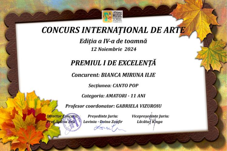 Este vorba de Bianca Miruna Ilie (11 ani), Maria Ancuța (13 ani) și Mihaela Ștefania Giors (14 ani), care și-au făcut debutul în lumea festivalurilor de muzică ușoară participând la Concursul Internațional de Arte, Ediția a IV-a de toamnă, organizat de „Diana Music School” Florești, și care au câștigat inimile membrilor juriului. Cele trei mici vedete, școlite la Brăila, au fost răsplătite cu Premiul I de Excelență la secțiunea Canto pop a concursului. Profesoara Gabriela Vizuroiu, îndrumătoarea celor trei talentate eleve ale Școlii Populare de Arte „Vespasian Lungu” Brăila, a fost, de asemenea, răsplătită cu Diploma de Excelență „pentru rezultatele deosebite obținute cu elevii” la Concursul Internațional de Arte, Ediția a IV-a de toamnă, care s-a desfășurat pe data de 12 noiembrie. Președintele juriului a fost Lavinia-Doina Zanfir.