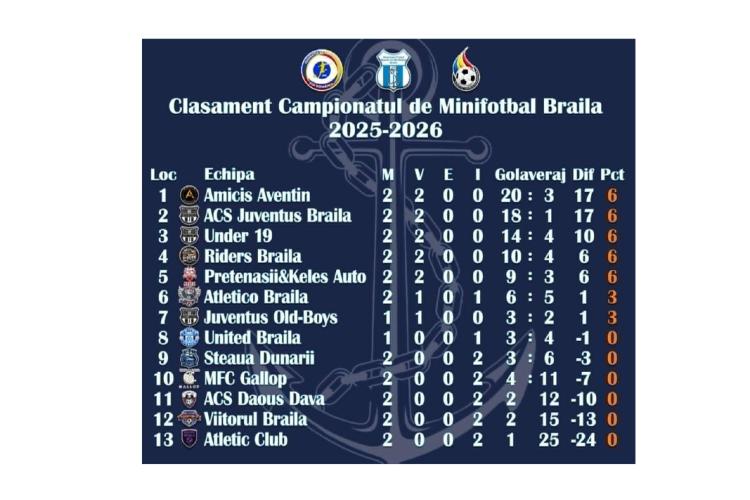După etapa a 2-a sunt cinci formații cu maximum de puncte, 6, ordinea în clasament fiind alcătuită după criteriul golaverajului: 1. Amicis Aventin, 2. Juventus Brăila, 3. Under 19, 4. Riders Brăila, 5.  Pretenașii&Keles-Auto.
