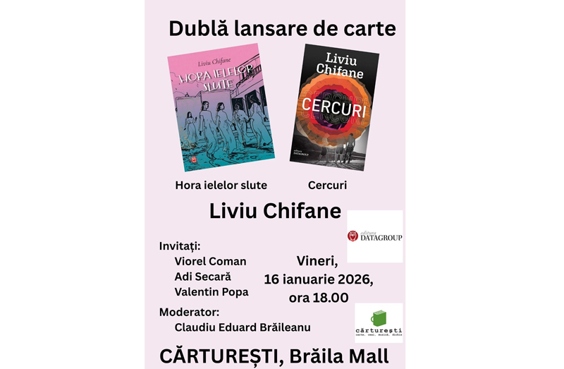Profesor de limba și literatura română la Liceul cu Program Sportiv, scriitorul brăilean Liviu Chifane, neobosit promotor al culturii în orașul nostru – sufletul Cenaclului „Alter Ego”, de la Biblioteca Județeană „Panait Istrati” Brăila – își va lansa volumele „Hota ielelor slute” și „Cercuri” în ziua de vineri, 16 ianuarie, ora 18:00, la Librăria Cărturești, de la Brăila Mall. Evenimentul va fi moderat de dr. Claudiu Eduard Brăileanu, autorul avându-i ca invitați pe scriitorii Viorel Coman, Adi Secară și Valentin Popa, care vor prezenta cele două volume proaspăt scoase de sub tipar.