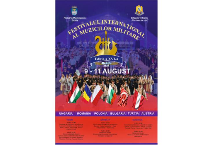Primăria Municipiului Brăila, în parteneriat cu Brigada 10 Geniu „Dunărea de Jos” organizează, la sfârșitul acestei săptămâni, mai precis în perioada 9 – 11 august, cea de a XVI-a Ediție a Festivalului Internaţional al Muzicilor Militare, singura manifestare de acest gen care se desfășoară în România începând cu anul 1996.