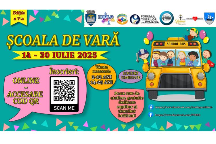 • Școala de Vară revine la Brăila cu cea de-a V a ediție și peste 200 de activități gratuite dedicate copiilor și tinerilor cu vârste între 3 și 25 de ani • organizat de Centrul de Tineret – Brăila Youth Hub și Forumul Tinerilor din România – Brăila, programul propune o vară plină de cursuri, ateliere, tabere și jocuri educative