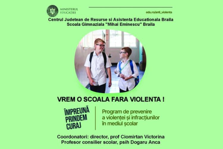 Școala Gimnazială „Mihai Eminescu” din Brăila a obținut în anul școlar 2024-2025 finanțare din partea Ministerului Educației pentru implementarea programului național „Împreună prindem curaj”, o inițiativă menită să prevină și să reducă violența în mediul școlar. Acest program ambițios reprezintă un pas semnificativ în prevenirea și reducerea violenței și infracționalității în mediul școlar, având scopul de a crea un climat educațional sigur, primitor și de susținere pentru elevi, cadrele didactice și părinți.
