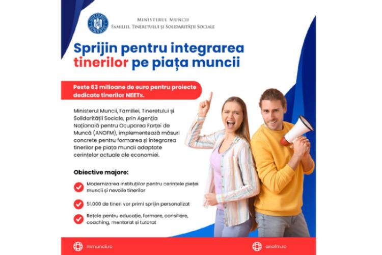 • Ministerul Muncii, Familiei, Tineretului și Solidarității Sociale, prin ANOFM, alocă peste 63 milioane de euro pentru proiecte dedicate tinerilor care nu sunt angajați și nu urmează niciun program de formare prefesională • „Prin aceste investiții, ne asigurăm că niciun tânăr nu este lăsat în urmă”, precizează ministrul Simona Bucura Oprescu • peste 50.000 de tineri din toată țara vor primi sprijin personalizat, promite ministrul