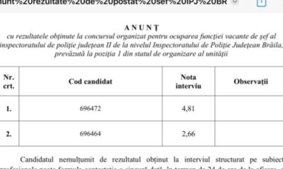 • pe 12 decembrie, a avut loc la Poliția Română concursul pentru ocuparea postului de inspector șef al Inspectoratului de Politie Județean Brăila * s-au înscris...