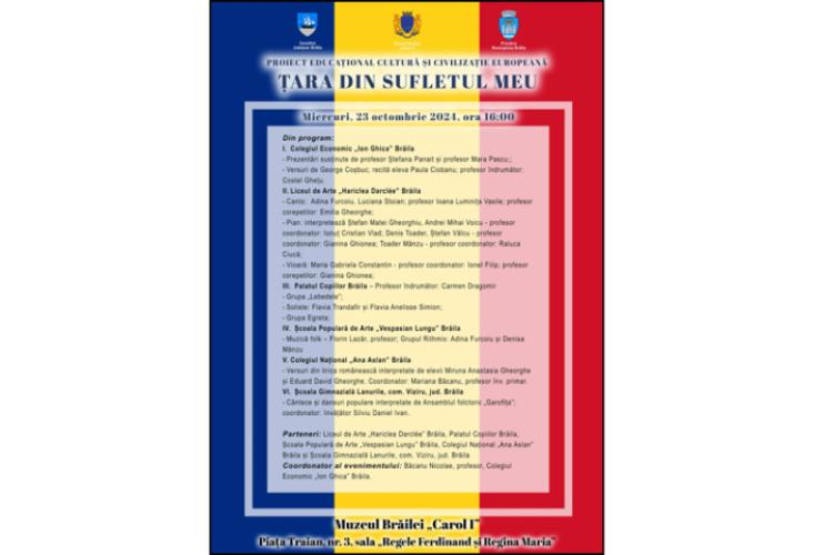 Muzeul Brăilei „Carol I” găzduiește miercuri, 23 octombrie, ora 16:00, la sediul central din Piața Traian nr. 3 (Sala „Regele Ferdinand I și Regina Maria”), un grandios spectacol de muzică și poezie organizat de Colegiul Economic „Ion Ghica” Brăila, în parteneriat cu Liceul de Arte „Hariclea Darclée”, Palatul Copiilor, Școala Populară de Arte „Vespasian Lungu”, Colegiul Național „Ana Aslan” și Școala Gimnazială Lanurile, comuna Viziru.