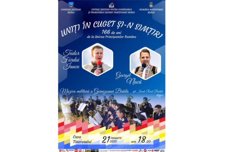 • evenimentul va avea loc marți, 21 ianuarie, la împlinirea a 166 de ani de la Unirea Principatelor Române • participă Tudor Furdui Iancu, Georgel Nucă și Muzica Militară a Garnizoanei Brăila, condusă de cpt. Ionuț-Raul Badale • biletele pentru spectacol se pun în vânzare începând cu 10 ianuarie
