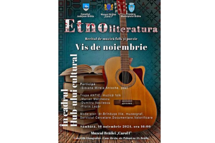 Muzeul Brăilei „Carol I”, Consiliul Județean Brăila și Primăria Municipiului Brăila organizează sâmbătă, 16 noiembrie, începând cu ora 16:00, o nouă întâlnire în cadrul Hub-ului cultural „Etnoliteratura”. Evenimentul, intitulat sugestiv „Vis de noiembrie”, se va desfășura la Colecțiile Etnografice ale Muzeului Brăilei „Carol I” (Casa Alexiu, monument istoric de arhitectură de pe Strada Polonă nr. 14). Organizatorii întâlnirii de sâmbătă invită publicul brăilean să participe la un inedit recital de muzică folk și poezie.Participă: Sibiana Mirela Antoche, poet brăilean, și Trupa ANTIC, formată din talentații interpreți Marian Marinescu, Dumitru Vasilescu și Florin Lazăr, care vor interpreta muzică folk. Moderator al evenimentului cultural de sâmbătă, 16 noiembrie, este dr. Brîndușa Ilie, muzeograf la Serviciul Cercetare, Documentare, Valorificare al Muzeului Brăilei „Carol I”.