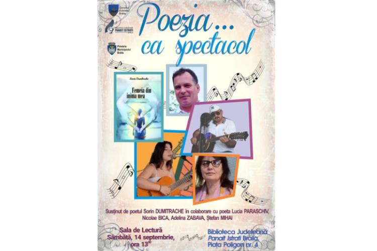 Brăilenii iubitori de muzică folk, poezie și bună dispoziție sunt invitați sâmbătă, 14 septembrie, începând cu ora 13.00, la evenimentul intitulat „Poezia… ca spectacol”, un program captivant cu muzică folk și poezie de bună calitate, susținut de Sorin Dumitrache și Lucia Paraschiv. Potrivit organizatorilor, cu acest prilej va avea loc lansarea volumului de versuri „Femeia din inima mea”, de Sorin Dumitrache.