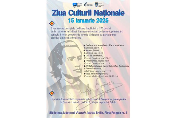 Ziua Culturii Naționale este sărbătorită la Biblioteca Județeană Panait Istrati Brăila printr-o serie de evenimente interactive, care încurajează dialogul în jurul valorilor artistice şi literare. În fiecare an în România şi Republica Moldova, la 15 ianuarie, este marcată data naşterii poetului Mihai Eminescu (1850-1889). Astfel, chiar în ziua în care se împlinesc 175 de la nașterea lui Eminescu, versurile lui se vor auzi la bibliotecă pe parcursul întregii zile, prin organizarea unor sesiuni de lectură, prezentări, întâlnire de cenaclu literar, concursuri de poezie și desene la care vor participa elevi din școlile brăilene.