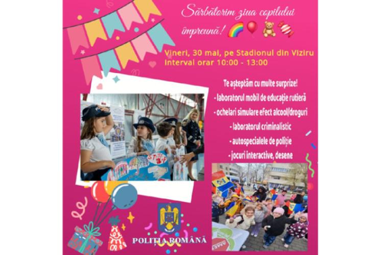 Pentru a marca Ziua Copilului, polițiștii brăileni pregătesc surprize pentru cei mici. Vineri, copiii sunt invitați la stadionul din Viziru, începând cu ora 10.00, unde polițiștii de la Rutier îi așteaptă cu lecții de educație rutieră, în cadrul unor jocuri adaptate vârstei. Elevii prezenți pot testa și ochelarii care simulează consumul de alcool sau droguri, tocmai pentru a înțelege de ce este interzis consumul acestora de către cei care se urcă la volan. Copiii vor avea parte și de alte surprize, astfel că sunt invitați cât mai mulți, alături de părinți, bunici și profesori.